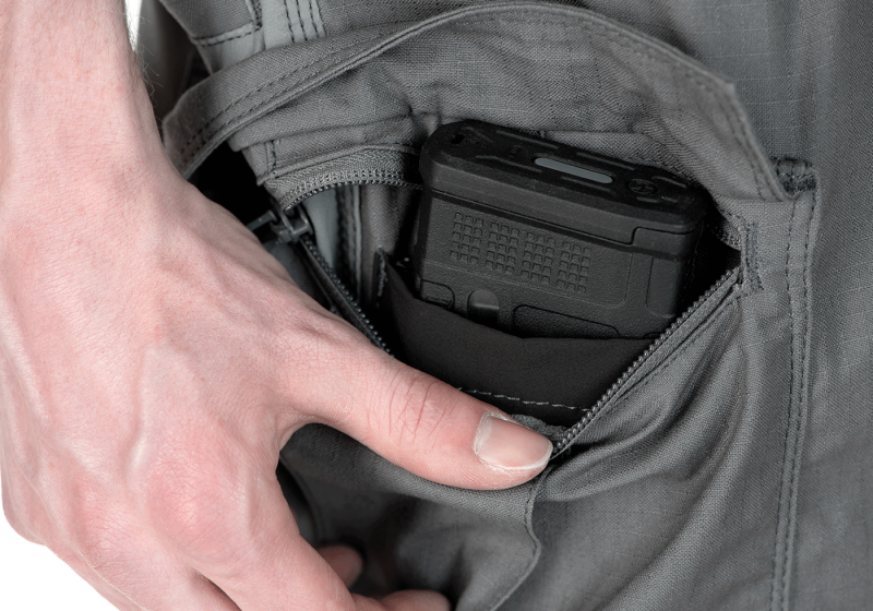 • 2 hlboké vrecká s horným otvoreným bočným vstupom (na ruky, kľúče, vreckovku, zatvárací nôž atď.). Obe vrecká sú na vonkajších okrajoch podšité druhou vrstvou látky pre väčšiu odolnosť pri pripájaní spony na nôž alebo iného vybavenia. Na prednej strane nohavíc, na pútkach na opasok, sú 2 "D" krúžky (1 na každej strane) na zavesenie kľúčov a drobných predmetov. Nohavice sú vybavené 2 úložnými stehennými vreckami s horným vstupom na zips prekrytým klopou. Vo vnútri stehenných vreciek je vrecko na časopisy. Úložný priestor nohavíc bol rozšírený aj o priehradky s horným otvoreným vstupom, ktoré sú určené predovšetkým na uloženie zásobníka s možnosťou veľmi rýchleho prístupu. Vrecko je dostatočne hlboké, takže sa nemusíte obávať vypadnutia zásobníka ani pri rýchlejšom pohybe. Toto tunelové vrecko možno použiť aj na uloženie napríklad klobúka, baretky atď.