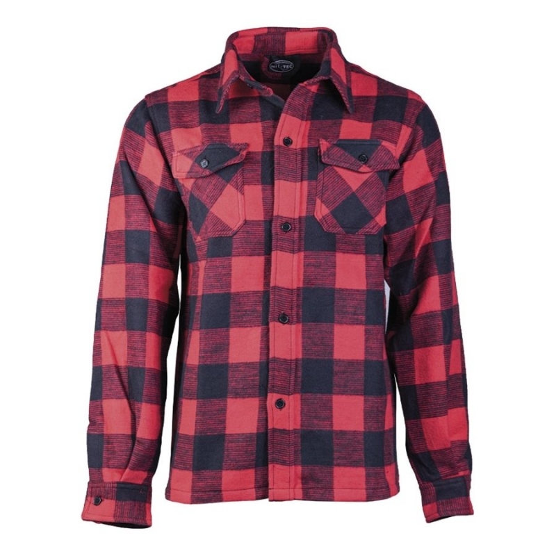 Červeno-čierna košeľa na gombíky veľkosti 3XL od spoločnosti MIL-TEC. Drevorubačská košeľa s klasickým károvaným vzorom z hrubého bavlneného materiálu (330 g/m2).